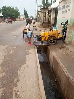 Households also source water from numerous private shallow wells.[39] Or households rely on street vendors, creating a thriving market for “sachet water”, purified water packaged in polyethylene pouches.[38] Water vendors called Mairuwa sell water from tanks and drums on carts, which is sometimes sold to other vendors that carry water in buckets or gerry cans.[39] Access to water provided by the state Water Corporation is 'metropocentric' i.e., centred around the metropolis.[40]