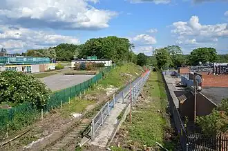The Croxley Green branch was temporarily closed in 1996 when a local road construction scheme severed the line and it was formally closed in 2003.[2] However, Watford Stadium Halt had not been used for some years prior to this, although it is not known exactly when the halt was last used.[3] The halt was not demolished and the station furniture, including the lampposts and signage, was left in situ. Despite nature reclaiming the station, the platforms and station furniture (apart from the station nameboards) were still in place when clearance work in preparation for the Croxley Rail Link began.[3][4] This was a proposal to extend the London Underground Metropolitan line to Watford Junction. The project would have involve re-opening part of the Watford and Rickmansworth line and running the Metropolitan line along this line, and the construction of two new stations. Watford Stadium Halt would not re-open. One of the new stations, Watford Vicarage Road, to be located on the other side of the Vicarage Road bridge, would serve Watford General Hospital and the football stadium.[5][6]