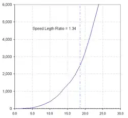 Graph of power versus speed for a displacement hull, with a mark at a speed–length ratio of 1.34