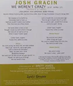 - ^ Malec, Jim (October 9, 2007). "Josh Gracin - "We Weren't Crazy"". The 9513. Archived from the original on October 28, 2007. Retrieved July 30, 2008.