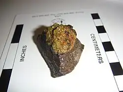 Within the weathering environment, chemical oxidation of a variety of metals occurs. The most commonly observed is the oxidation of Fe2+ (iron) by oxygen and water to form Fe3+ oxides and hydroxides such as goethite, limonite, and hematite. This gives the affected rocks a reddish-brown coloration on the surface which crumbles easily and weakens the rock. Many other metallic ores and minerals oxidize and hydrate to produce colored deposits, as does sulfur during the weathering of sulfide minerals such as chalcopyrites or CuFeS2 oxidizing to copper hydroxide and iron oxides.[37]