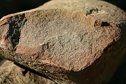A freshly broken rock shows differential chemical weathering (probably mostly oxidation) progressing inward. This piece of sandstone was found in glacial drift near Angelica, New York.