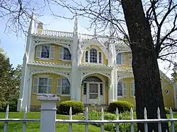 Once called the "most photographed house in the state" of Maine,[1] the Wedding Cake House, known formally as the George W. Bourne House, is a historic house located at 104 Summer Street in Kennebunk, Maine. The home was built in 1825 by shipbuilder George W. Bourne (1801–1856), who later built a frame barn which he connected to the main house with a carriage house. In 1852, the barn caught fire and the carriage house was demolished to keep the fire from spreading to the house. Bourne, who during a European tour had been impressed by the Gothic beauty of the cathedral at Milan, rebuilt the carriage house and barn in what later came to be known as Carpenter Gothic style. Using hand tools, he crafted five buttresses with pinnacles on top of each. Then in order to tie the new structures in with the existing house, he added six buttresses with pinnacles to the house and then joined them together with intricate woodwork. His only help in doing this was Thomas Durrell, an apprentice ship's carpenter. Bourne spent the rest of his life adding to these embellishments.[2] It has been said of Bourne: "The highly skilled carpenter knew no limits to his skill."[3]