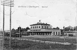 In the early 1870s planning began for a railway line from Augsburg to the Ammersee (Lake Ammer) and continuing towards the Alps. In 1886, the Bavarian government approved the Ammersee Railway, running from Mering near Augsburg via Diessen to Weilheim. Construction of the line began in the autumn of 1886. The Royal Bavarian State Railways opened the section from Weilheim to Dießen on 30 June 1898 and the whole line from Mering to Weilheim was opened on 23 December 1898. Weilheim station became a crossing station. In the 1900s, another building was built for a station restaurant as a southern extension of the entrance building. In addition, the platform roofing was extended on the platform next to the station building.[5] On 1 January 1917, the Weilheim–Peissenberg line (also known as the Pfaffenwinkelbahn—Pfaffenwinkel Railway—after the Pfaffenwinkel region, which lies mainly to the west and south of Weilheim) was extended to Schongau, where it connected to the existing Fuchs Valley Railway to Landsberg am Lech.