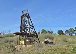 The Reform Mine has been described as the richest small gold field of its type in the world. Mining began here in the 1870s or earlier and prospered until the late 1890s. In 1935 the Wentworth Company built a new poppet head over the shaft to pump water in conjunction with the Wentworth Main shaft. At the height of the gold rush the whole hillside beyond the Reform site was a hive of activity, including a battery, foundry and grand two-storey mine office, along with houses, stables and numerous shafts and tunnels. Behind the Reform poppet head, impressive remains of bluestone walls can still be seen. Built on a series of levels, these formed the foundations of the mill, or battery. The small corrugated iron shed behind the poppet head, old equipment and overgrown mullock heaps are other reminders of years of toil by hundreds of men.[1]