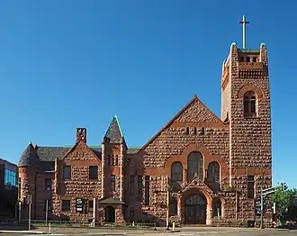 The Wesley United Methodist Church (formerly the Wesley Methodist Episcopal Church) building was constructed of granite, stone, brick, and sandstone in Richardsonian Romanesque style, featuring round-arched windows and multiple towers. When built, the building was in the residential neighborhood of Loring Park at 101 Grant Street East; it was built during Minneapolis' building boom in the last decade of the 19th century.[3] Architect Warren H. Hayes (1847–1899) was Minneapolis' leading designer of churches in the 19th century, having designed the Calvary Baptist Church, Fowler Methodist Episcopal Church, and the First Congregational Church, as well as the Central Presbyterian Church in Saint Paul.[4] Today the location is overwhelmed by the neighboring Minneapolis Convention Center.