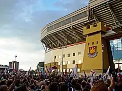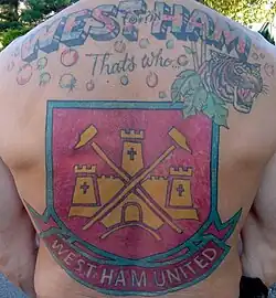 West Ham United F.C. supporters, commonly known as Hammers, are the followers of the London-based West Ham United Football Club, who were founded as Thames Ironworks in 1895. There are 700,000 fans on the club's database and over 2,300,000 likes on Facebook.[1] The club's website is in the top ten most visited websites for English football clubs by people in the USA.[2] Their fans are also associated with a once-notorious hooligan element[3] and have long-standing rivalries with several other clubs, most notably Millwall.