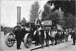 I am able to supply a unique photograph of an incident that happened during the construction of the line owing to this canal. The engine had been brought down to Chichester and was much wanted on the other side of the canal, but as the bridge was not completed for traffic it was impossible to cross. The little locomotive, therefore, had to perform a slow and circuitous journey by road of over 3 miles (4.8 km), being hauled by a traction engine on rails, simply placed down on the road in front of the railway engine and taken up from behind it alternately.[3]