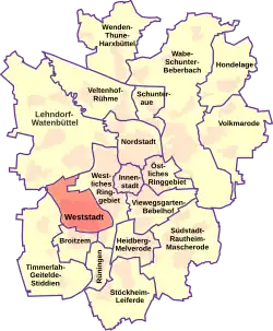 The Weststadt ("western city") is a Stadtbezirk (borough) in the western part of Braunschweig, Germany.[2] With a population of 23,298 (2020) it is the city's third most populous district.