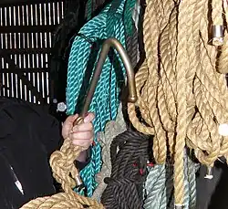 The pilot whales that are not beached were historically stabbed in the blubber with a sharp hook, called a sóknarongul (a kind of gaff), and then pulled ashore. In 1993, a blunt gaff or blásturongul was invented that could be used to hold the beached whales steady by their blowholes and pull them ashore. In 1985, the Faroe Islands outlawed the use of spears (skutil) and harpoons (hvalvákn) in the hunt, as these weapons were considered to be unnecessarily cruel to the whales.[10] According to the 2013 Whale Hunt Law, whales must be either ashore or stuck on the seabed before they can lawfully be killed,[9] and, as of 26 January 2017, only the men waiting on the beaches with blásturkrókur, mønustingari and grindaknívur are permitted to kill the whales, and it is no longer permitted to harpoon the whales while at sea, or hook those outside of the encircling net.[11]