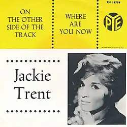 Trent recorded "Where Are You Now" shortly before travelling to South Africa for a three-month tour.[2] Speaking in 1965, the singer said she was "so used to having near-misses" that she had already started looking for a follow-up to the song after recording it.[8] The second series of It's Dark Outside was transmitted during Trent's absence from the UK, with "Where Are You Now" used diegetically in several episodes, played incessantly by the doomed female lead Claire (played by Veronica Strong).[2][9][10] Many viewers contacted shops and publications to inquire about the song,[2] prompting Pye to issue Trent's recording as a single backed with a version of "On the Other Side of the Tracks", written by Cy Coleman and Carolyn Leigh for the 1962 Neil Simon musical Little Me.[11] Trent performed the song on the 29 April 1965 edition of BBC1's Top of the Pops.[12] For one week in May 1965, the single made number one on the Record Retailer, Disc, NME and Melody Maker charts in the UK, knocking the Beatles' "Ticket to Ride" off the top spot on the latter two charts.[13] Trent was informed of the record making number one ahead of her performance at the London Palladium.[14] The song reached number three in Canada.[15]