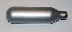 The cylinders are about 6.3 centimetres (2+12 in) long by 1.8 cm (34 in) wide, with a volume of 10 cubic centimetres (0.6 cu in) and capacity for most brands of 8 grams (14 oz) of pressurized N2O. Their walls are about 2 millimetres (116 in) thick to withstand the pressure of the gas, and they are rounded at one end with a narrow tip at the other end. While refillable chargers were once available, all chargers are now non-refillable; the latter consist entirely of recyclable steel.[2]