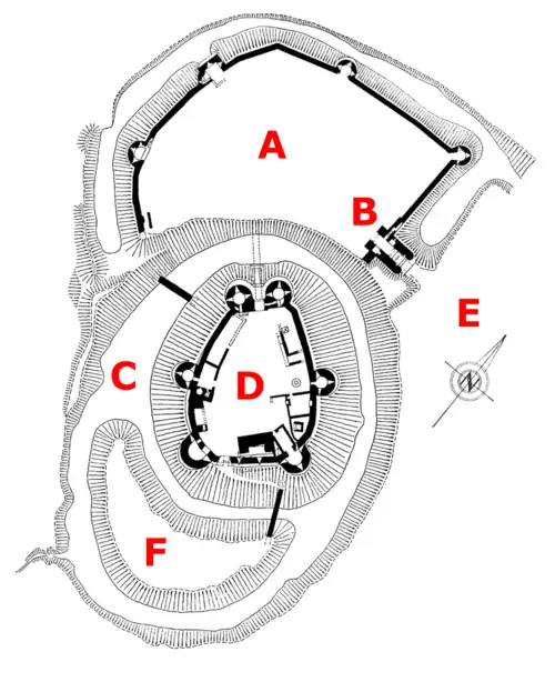 Plan of the castle: A – outer ward; B – outer gatehouse; C – moat; D- inner ward; E – former location of outer enclosure; F – hornwork
