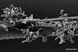 The fungus Pseudogymnoascus destructans is the primary cause of WNS.[28] It preferably grows in the 4–15 °C range (39–59 °F) and will not grow at temperatures above 20 °C (68 °F).[29] It is cold loving or psychrophilic. It is phylogenetically related to Geomyces spp., but with a conidial morphology distinct from characterized members of this genus.[22] Early laboratory research placed the fungus in the genus Geomyces,[22][30] but later phylogenic evaluation revealed this organism should be reclassified within Pseudogymnoascus.[31]