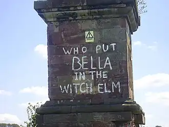 In 1944, graffiti related to the mystery began to appear on the walls of nearby areas. The first, reading "Who put Luebella down the wych elm?", was found at Hayden Hill Road, Old Hill, followed shortly by "Who put Bella down the wych elm, Hagley Wood?" on a wall in Upper Dean Street, Birmingham. Since the writing was too high to have been done by boys, they were taken seriously and provided investigators with several new leads for tracing who the victim could have been.[14] Since at least the 1970s, similar graffiti have sporadically appeared on the Hagley Obelisk, near where the woman's body was discovered. The latest, dating from 1999, was modified to "Who put Bella in the witch elm?", favouring the witchcraft theory. Then in 2020, the "who" in white was overpainted in red with "hers", surmised by the Stourbridge News to be the name of a Birmingham graffiti artist.[15]