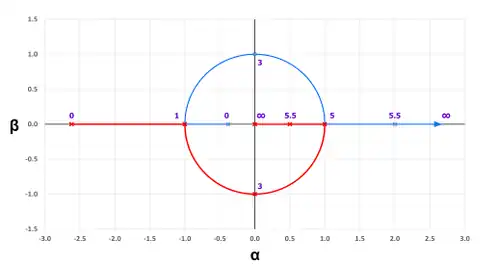 Root locus plot of Wien bridge oscillator pole positions for R1 = R2 = 1 and C1 = C2 =1 versus K = (Rb + Rf)/Rb. The numerical values of K are shown in a purple font. The trajectory of the poles for K=3 is perpendicular to the imaginary (β) axis. For K >> 5, one pole approaches the origin and the other approaches K.[34]