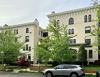 The apartment complex formerly known as Windsor Lodge is located in Washington's Sheridan-Kalorama neighborhood, at the northeastern corner of Wyoming Avenue NW and Thornton Place NW. It consists of two four-story buildings joined by a party wall in a rear connecting section to form a U shape. Its walls are formed out of red brick that has been painted a cream color. The two halves of the building are stylistically similar, but are not identical, differing in plan and detail. Each has its main entrance in the center of its front facade; that on the left is sheltered by a wide bracketed hood that also forms a balcony on the second floor, while the right one has a more elaborate porch. William Borah's apartment was the one on the second floor right side of the eastern half.[3]