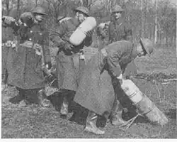 Late in August 1915, Livens left Chatham to join one of the newly formed Royal Engineer Special Gas Companies where he was one of very few officers to have a background in engineering rather than chemistry.[11] At the time, gas warfare was very primitive: heavy cylinders of poison gas were manhandled to the front trenches and their contents simply vented out through metal pipes relying on a breeze to carry the toxic cloud over the enemy trenches. But the wind could be fickle and change in its direction: the first British gas attack at the Battle of Loos was a disaster. Livens developed the use of long rubber hoses to carry the gas to an optimum location for release and of a manifold that reduced the number of parapet pipes by connecting four cylinders to a single pipe, these improvements helped make the system more reliable.[17] Major-General Foulkes described him as a "go getter", but also as unfamiliar with military protocol;[18] Foulkes later recalled Livens' part in the preparation of a gas attack on the Hohenzollern Redoubt: