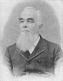 William Jefferson White was born at Ruckersville, Georgia, on December 25, 1831, to Chaney and William White.[1] His father was white and his mother had African-American and Native American ancestors. He could pass for white and called himself black.[2] His mother was a slave, but he never was.[3] He was taught to read by his mother. At the age of seven he started working in a cotton factory, where he worked for three years. He also spent a short time working on a wagon travelling in rural parts of the state selling the factory's goods. In June, 1842, he went to Augusta, Georgia, where he lived with the family of Captain W. G. Nimms and learned to write. He then took an apprenticeship as a carpenter for W. H. Goodrich, where he stayed for five years before moving on to cabinet making under C. A. Platt & Co., where he spent two years. He continued this work until 1867. During the American Civil War (1861–1865), the blockade denied printing supplies to Southern printers, and White learned to make printers' wooden furniture, which helped him in his later journalism career.[1] He never formally attended college, but did take part in the courses at the Augusta Institute, which he helped found,[4] and in 1889 was given an honorary degree of Doctor of Divinity by the State University of Kentucky.[1]
