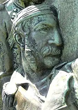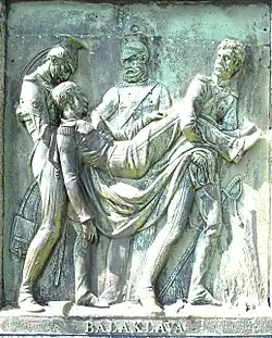 - Hatherleigh: in 1860 funded by public subscription an obelisk made from ashlar granite[39] was erected near Fishleigh on the north edge of Hatherleigh Moor in Devon, on a site with a spectacular view southwards towards Dartmoor.[40] On its base is a bronze relief sculpture by Edward Bowring Stephens inscribed BALAKLAVA, showing the wounded Morris being carried by three soldiers.[3][41] The decorative iron gates in front of the monument show the following inscription on two escutcheons:
