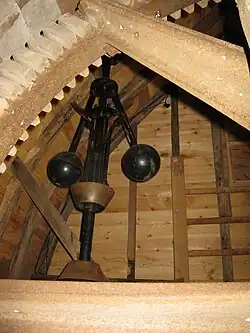 Windmill Hill Mill is a post mill on a two-storey roundhouse. She has four patent sails carried on a cast-iron windshaft and was winded by a tailpole.[2] Winding is now computer-controlled, with an automatic turning device installed that receives information about the wind direction from sensors mounted on the mill. The wooden brake-wheel is of clasp-arm construction, with oak arms and an elm rim. It has 104 cogs and drives a stone nut with twelve cogs. The tail wheel is of cast iron, with 130 cogs.[9] The mill drove two pairs of millstones, arranged head and tail.[2] The headstones are Peak stones and the tailstones are French Burrs.[9] The body of the mill is 21 feet 3 inches (6.48 m) long and 12 feet 3 inches (3.73 m) wide, the largest surviving post mill by floor plan in the United Kingdom.[1] It is 50 feet 10 inches (15.49 m) high to the roof, the second tallest post mill in England.[9] The roundhouse is 22 feet 6 inches (6.86 m) in diameter and has a single-storey lean-to extension of part of its circumference. When originally built, the mill had a single-storey roundhouse which was raised in the 1850s. The Hammond's Sweep Governor was fitted in the 1870s.[2]