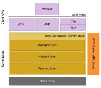 The Next Generation TCP/IP stack connects to NICs via a Network Driver Interface Specification (NDIS) driver. The network stack, implemented in tcpip.sys implements the Transport, Network and Data link layers of the TCP/IP model. The Transport layer includes implementations for TCP, UDP and unformatted RAW protocols. At the Network layer, IPv4 and IPv6 protocols are implemented in a dual-stack architecture. And the Data link layer (also called Framing layer) implements 802.3, 802.1, PPP, Loopback and tunnelling protocols. Each layer can accommodate Windows Filtering Platform (WFP) shims, which allows packets at that layer to be introspected and also host the WFP Callout API. The networking API is exposed via three components:[1]