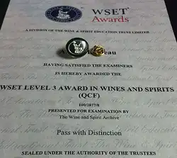 Award certification letter and pin for completion of the Level 3 program in Wine & Spirits.