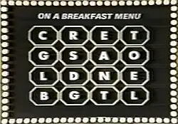 A typical main-game board from the original format. Winning words for this category include TOAST, EGGS, and CEREAL.