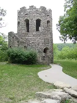 Clark Tower is located in the park. The tower was built from 1926 to 1927 to stand as a memorial for Caleb and Ruth Clanton Clark, one of the original pioneer families that settled in Madison County. It was built by the couple's descendants. The limestone tower is 12 feet (3.7 m) wide and 25 feet (7.6 m) high. A short distance from Clark Tower is a stone house's ruins, where it is claimed that Frank and Jesse James slept one night. It is also rumored that the house is haunted.[1]