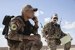 On 11 March and 14 March 2020, Camp Taji was attacked, supposedly by Kata'ib Hezbollah, killing three Coalition personnel.[23] The United States responded to the first attack on Camp Taji by targeting five Kata'ib Hezbollah weapon storage facilities with air strikes.[24] On 19 March 2020, the al-Qaim base near the Iraq–Syria border was transferred from the coalition to Iraqi security forces.[25] Iraqi major general Tahsin Khafaji stated "This is the first step of US troops withdrawing from Iraq."[25] On 20 March 2020, CJTF-OIR confirmed that certain troops would be withdrawing from Iraq due to the COVID-19 pandemic.[26] On that same day, United States Central Command ordered a 14-day "stop movement" preventing any U.S. troops from entering or leaving Iraq and Afghanistan because of the pandemic.[27]
