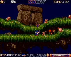 The game takes place on a series of levels, each divided into eight worlds. Each world has a distinct graphical style and music, but the basic gameplay remains the same. Wiz and/or Liz must run through the landscape collecting wabbits against a strict time limit. To win, the player must collect floating letters that appear when a wabbit is collected to spell out a magic word shown at the top of the screen. Once an entire word is collected, the player then must rescue all remaining wabbits on the level, who now release collectable fruit, stars, and clocks to increase the time limit. The limit starts at three minutes and is only restarted when the player character dies. This time limit can however be extended by collecting a glowing orange orb which appears in the last ten seconds of a countdown and gives thirty seconds of bonus time.