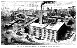 By 1866, the company employed about 230 workmen and manufactured about a thousand pianos a year,[18]—up to 30 a week—including uprights, squares, and grands. The factory was equipped with a 30 horsepower (22 kW) steam engine, as well as steam-powered elevators and drying rooms, and had been augmented with a second 40-foot (12 m) wide building where grand cases, sounding boards, and actions were manufactured and cases varnished and iron frames gilded.[19] Further additions and a cupola completed the factory, which in 1869 fronted 210 feet (64 m) on Eutaw Street and 165 feet (50 m) on West Street.[20] Their sales ranked third in the United States, after Steinway & Sons of New York and Chickering & Sons of Boston,[21] and by 1870 their output was estimated to be about forty pianos a week, priced between $600 and $2,000.[22]