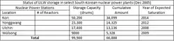 The four reactors at the Wolseong nuclear power plant are of CANDU, heavy water type, whereas the other seventeen reactors currently in South Korea are of the type LWR. CANDU reactors have the potential to use any uranium recovered from the waste from LWR reactors. These twenty-one reactors contribute about 70% of the LILW waste needing treatment and storage.