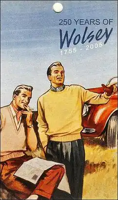 Wolsey is a heritage British clothing brand founded in 1755, making it one of the oldest existing textile companies in the world. The brand sells men's clothing and accessories, including a range of knitwear, socks, underwear and scarves. The company holds a Royal Warrant. Until 2017, it was based in Belgrave, Leicester, England, where it was originally established.[1] The company name, adopted in 1920 when R Walker & Sons merged with W Tyler and Sons, is a reference to Cardinal Wolsey. 'Wolsey' is a registered trademark.[2]