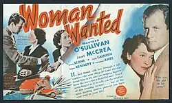 Woman Wanted is a 1935 American crime drama film directed by George B. Seitz and starring Maureen O'Sullivan and Joel McCrea. Written by Leonard Fields and David Silverstein, the film is about a woman wrongly convicted of murder who escapes with the help of a young lawyer who hides her from the police and the mobsters who set her up.[1]