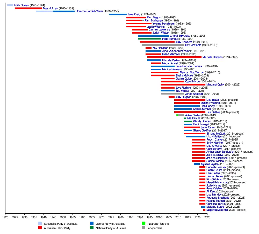 | 25 | Dianne Guise | Labor | Wanneroo | 10 February 2001 – 6 September 2008 (defeated) |