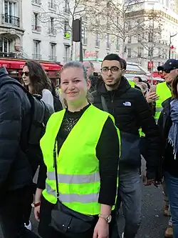 Marine Charrette-Labadie, then a 22-year-old, emerged as one of the early spokesperson in the "yellow vests" (French: gilets jaunes) movement.[6] She was one of eight official spokespeople.[32][22][33][34] This group was announced on 26 November 2018.[35] During her time as a spokesperson, Charrette-Labadie was contacted constantly by people in the movement asking for updates as to what had been accomplished and by members of the media seeking comment.[32] She was also being contacted by members of many political parties who were seeking to align themselves with the yellow vest leadership.[24]