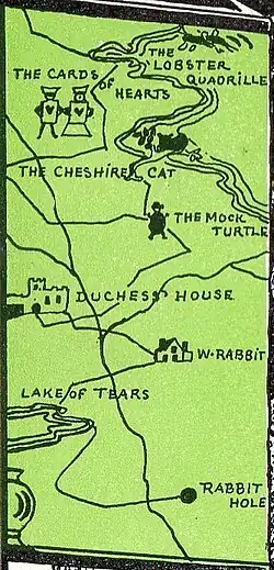 In the story, Wonderland is accessed by an underground passage, and Alice reaches it by travelling down a rabbit hole.[1] While the location is apparently somewhere beneath Oxfordshire, Carroll does not specify how far down it is, and he has Alice speculate whether it is near the center of the Earth or even at the Antipodes.[2]