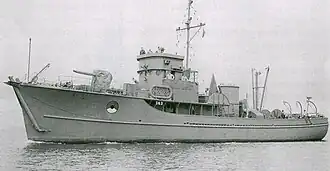 Minesweepers removed or detonate naval mines blocking ports and shipping lanes. Minesweepers were 80 to 136-foot boats. A wood hull boat was preferred for minesweepers, as some mines were magnetically activated. For the war 481 136-foot wood hull Minesweepers were built. The Hull designation was YMS for Yard Minesweeper.[32][33][34] They were armed with two 20mm cannons and one 3”/50 caliber gun. There were many different class minesweepers. Examples: USS Accentor (AMc-36),[35] The US Navy operated several classes of Minesweepers: YMS-1-class minesweeper, Hawk-class minesweeper, Kite-class minesweeper.[36][37]