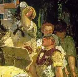 In the centre of the composition is a countryman who has recently moved to the town, identifiable by his rural smock. He is holding a brick-hod and drinking beer supplied by the man in the red waistcoat who is supposed to be a "bouncer" employed in a local pub. The beer seller's costume includes examples of cheap brummagem jewellery. His persona – including a copy of The Times under his arm – is a pastiche of a gentleman-flaneur. The two men behind him are imported Irish labourers, recognisable by their costume. This aspect of the painting is directly influenced by Hogarth's Beer Street.[6]