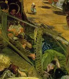 On the embankment between the upper and the lower road a group of unemployed rural labourers are sleeping in uneasy postures. A scythe wrapped in protective rope hangs over the railing that separates the productive from the unproductive figures in the composition. The Irish couple by the tree are feeding their baby with gruel, while an older man stands by the tree looking resentful. This aspect of the painting recalls Carlyle's discussion of unemployed Irish migrants in his book Past and Present.