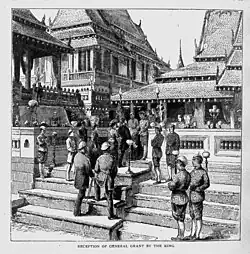 After India, Grant toured Burma and Singapore. After that, Grant traveled to Siam (Thailand) and met King Chulalongkorn of Siam at the Anantasamakhom Throne Hall (Old One) in the Grand Palace. Grant described him as a swift, energetic, and profoundly intelligent man, and Grant rested in Siam for a week and continued his journey to Cochinchina (Vietnam).[95]