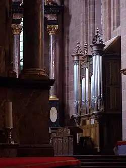 Klais Orgelbau built a swallow's nest organ with three manuals and 34 registers in 1985, which was slightly reorganised and re-toned in 2007. The machine has a mechanical playing action, the tracker action is electronic.