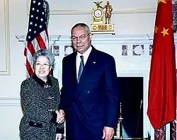Wu Yi (born November 1938) is a retired Chinese politician who served as a Vice Premier of China between 2003 and 2008. She was one of the country's most visible leaders during the first decade of the 21st century, best known for taking on the role of Minister of Health from April 2003 during the SARS outbreak, shortly after becoming vice premier. She was also a member of the Politburo of the Chinese Communist Party. She has since retired and left public life. She was commonly referred to as the "iron lady" by Chinese media, and was known to be a tough negotiator internationally.