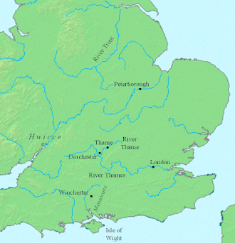 In addition to being Wulfhere's godson, King Æthelwealh of the South Saxons had a connection to the Mercians via marriage. His wife was Queen Eafe, the daughter of Eanfrith of the Hwicce, a tribe whose territory lay to the southwest of Mercia. The Hwicce had their own royal family, but it appears that at this date they were already subordinate to Wulfhere: the marriage between Æthelwealh and Eafe may well have taken place at Wulfhere's court, since it is known Æthelwealh was converted there.[53] The kingdom of the Hwicce is sometimes regarded as a creation of Penda's, but it is equally likely that the kingdom existed independently of Mercia, and that Penda and Wulfhere's increasing influence in the area represented an extension of Mercian power rather than the creation of a separate entity.[54][55]