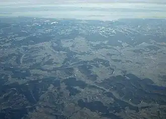 From the direction of the Feldberg to the Blumberg Gate (Blumberger Pforte, centre) the Wutach crosses the open South Baar countryside in a long forested gorge. From here it flows to the left through the Wutachflühen to the Rhine, whereas its former valley, 165 metres higher, continues to the right and runs down to the Danube.