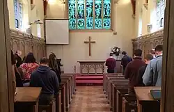 A chapel and bellcote was added between No. 54 and No. 52 in 1896, designed by architect George Wallace.[24] The chapel was opened by the Bishop of Oxford and has a stained-glass window depicting John Wycliffe. A vestry was added to the south side of the chapel in the 1930s, which is now being used as a prayer room. A 1961 reordering of the east end saw the introduction of candlesticks and altar frontals, which were removed in a later reordering. The 1960s metal reredos cross is now hung in the corridor between the main part of the hall and Old Lodge.