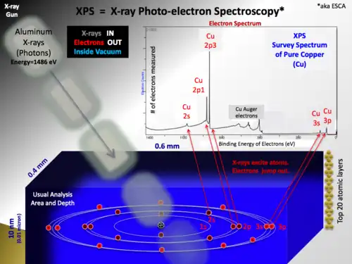 X-ray photoelectron spectroscopy (XPS) is a surface-sensitive quantitative spectroscopic technique that measures the very topmost 50-60 atoms, 5-10 nm of any surface. It belongs to the family of photoemission spectroscopies in which electron population spectra are obtained by irradiating a material with a beam of X-rays. XPS is based on the photoelectric effect that can identify the elements that exist within a material (elemental composition) or are covering its surface, as well as their chemical state, and the overall electronic structure and density of the electronic states in the material.[1] XPS is a powerful measurement technique because it not only shows what elements are present, but also what other elements they are bonded to. The technique can be used in line profiling of the elemental composition across the surface, or in depth profiling when paired with ion-beam etching. It is often applied to study chemical processes in the materials in their as-received state or after cleavage, scraping, exposure to heat, reactive gasses or solutions, ultraviolet light, or during ion implantation.