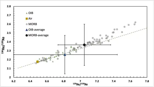 Selected Xe isotope data in mid-ocean ridge basalts (MORBs)[40] and ocean island basalts (OIBs),[43][44] compared with atmospheric value. Slope = 0.32. Figure is modified and simplified.[11]