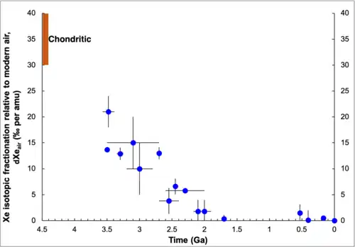 Mass fractionation of nine atmospheric xenon isotopes over Earth's history compared to modern air per atomic mass unit.[15] The Xe isotope distribution is derived from fluid inclusions in ancient rocks. Xenon isotope fractionation reached the modern value around 2 billion years ago (2 Ga). The cessation of fractionation may related to oxygenation of the Earth's atmosphere. Figure simplified with permission.[27]